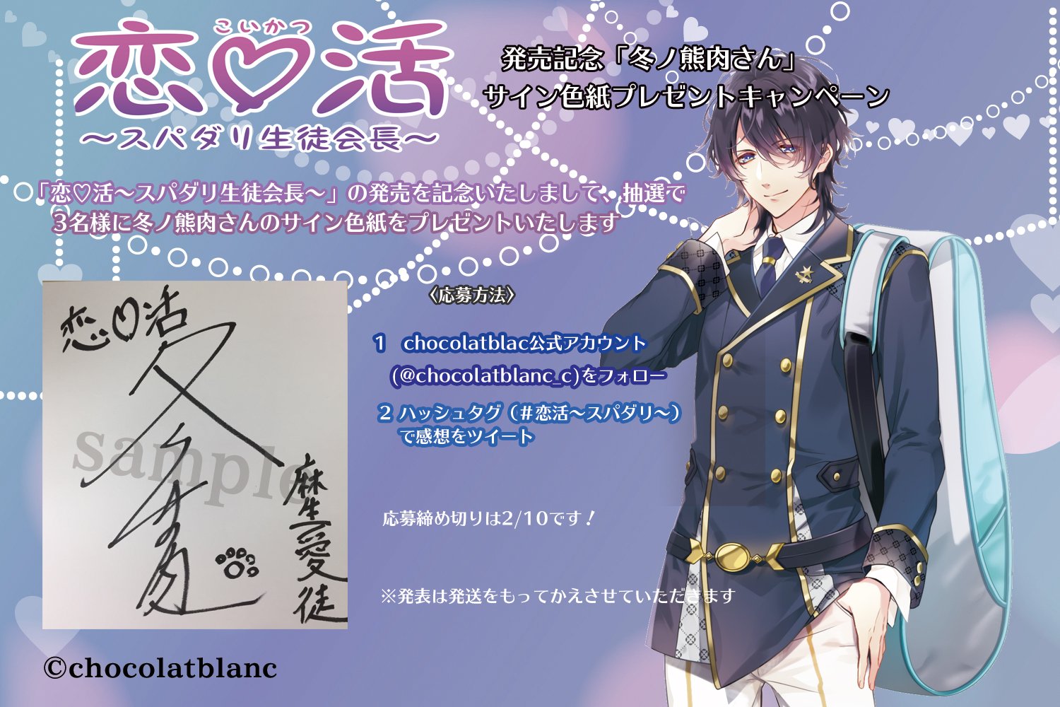 Chocolat Blanc 恋 活 スパダリ生徒会長 の発売を記念いたしまして 冬ノ熊肉さんサイン 色紙プレゼントキャンペーン を行います 公式アカウント Chocolatblanc C をフォロー 恋活 スパダリ で感想をツイートで応募完了です 当選者 の方には